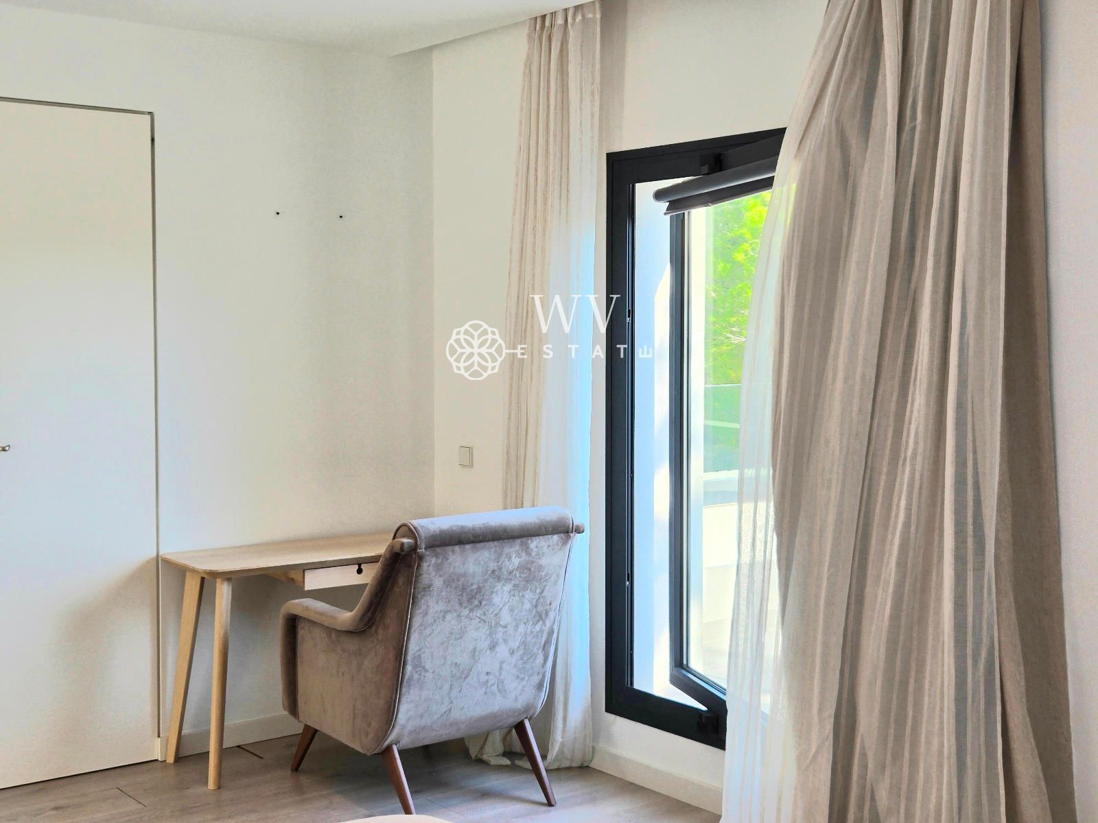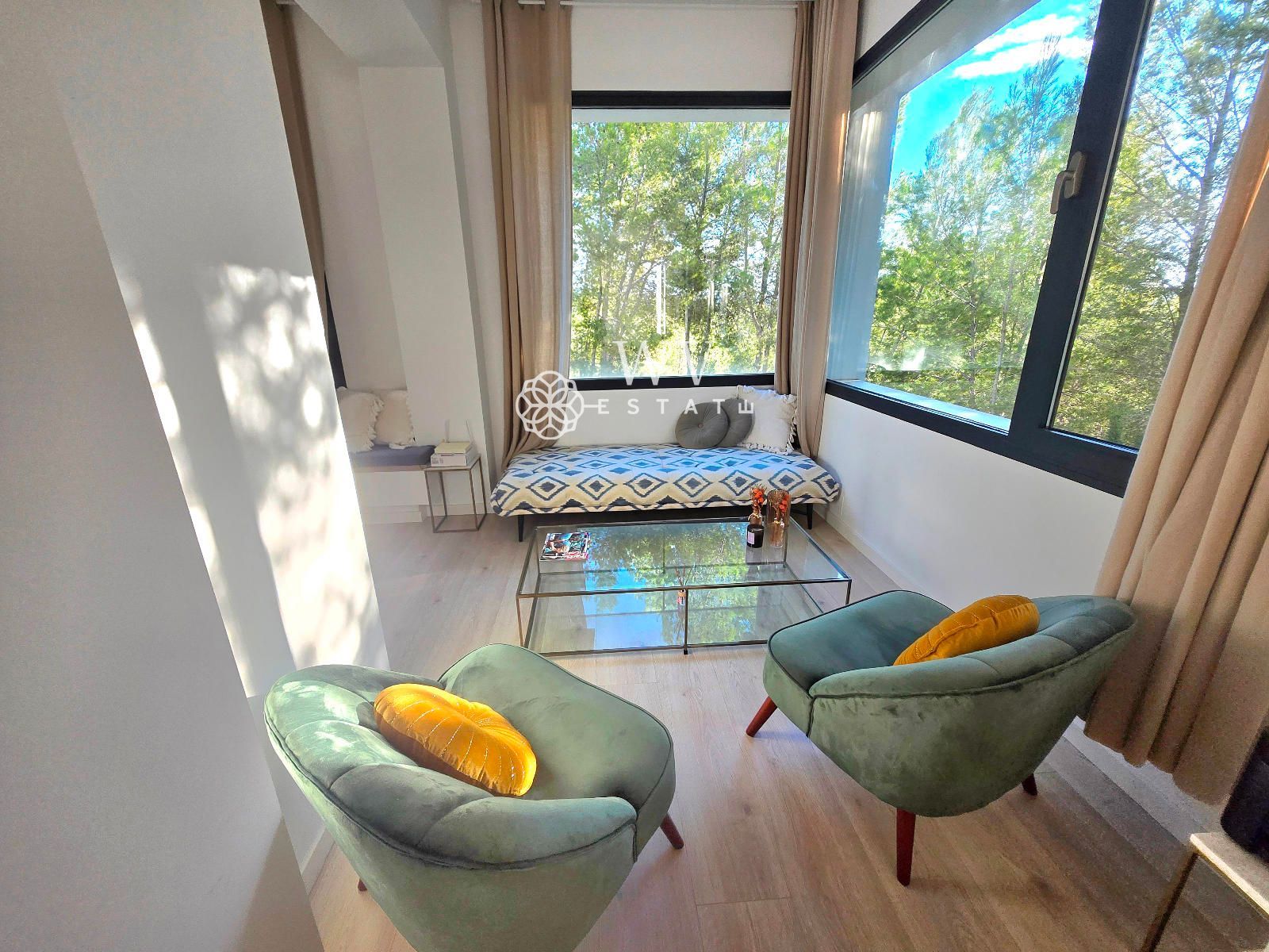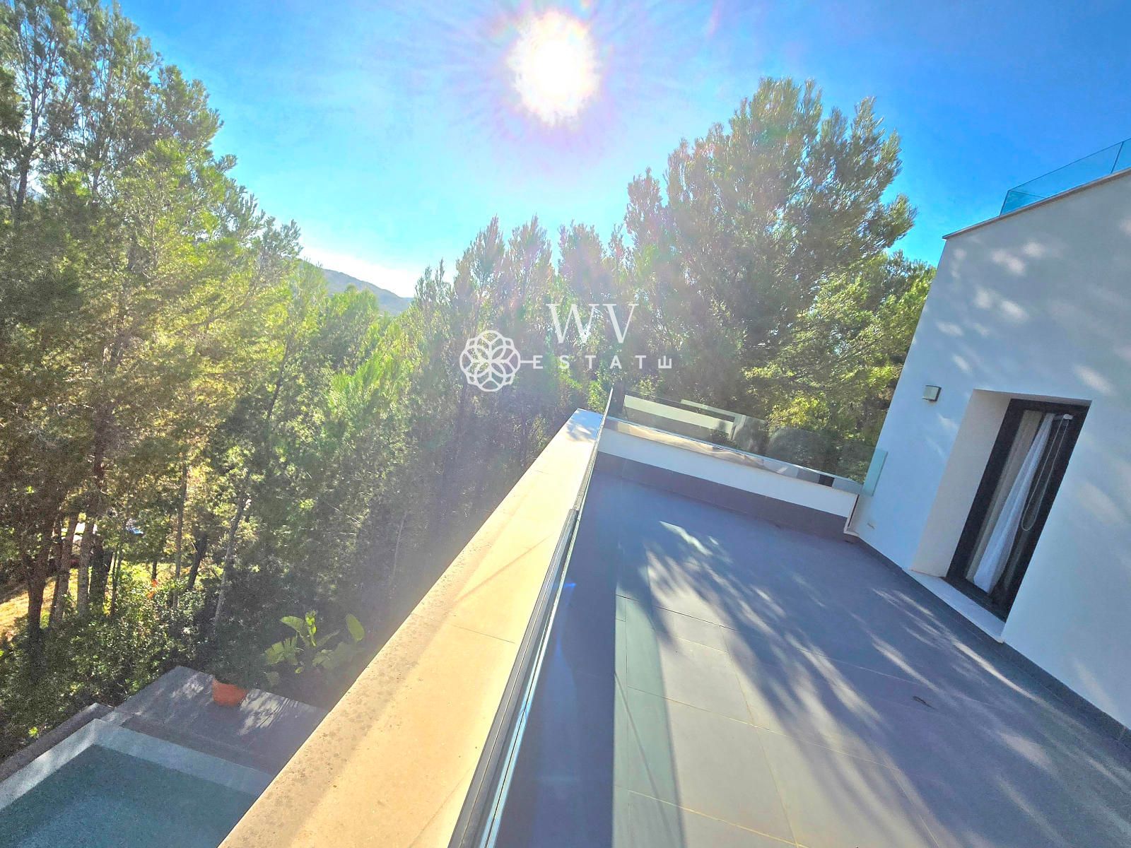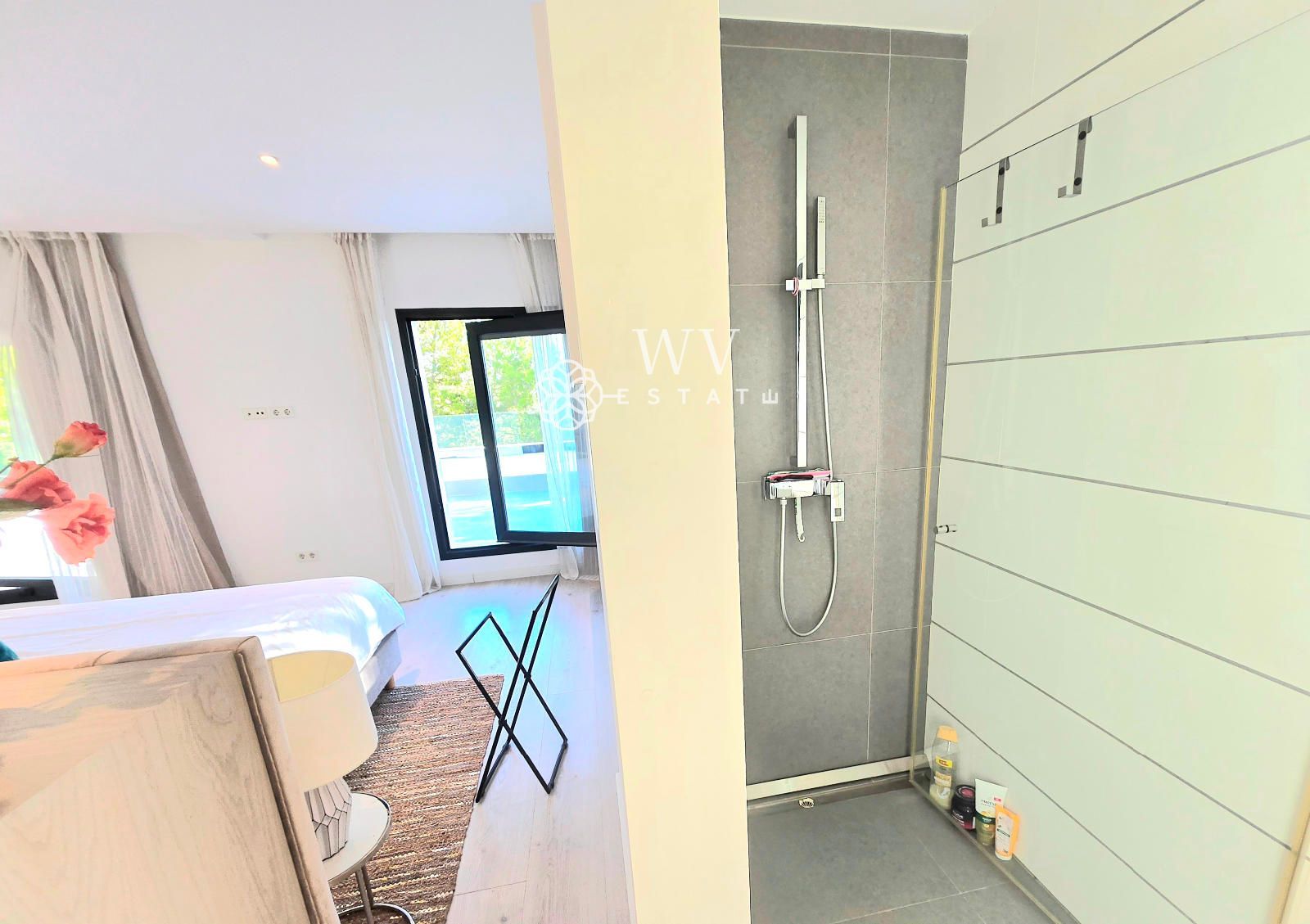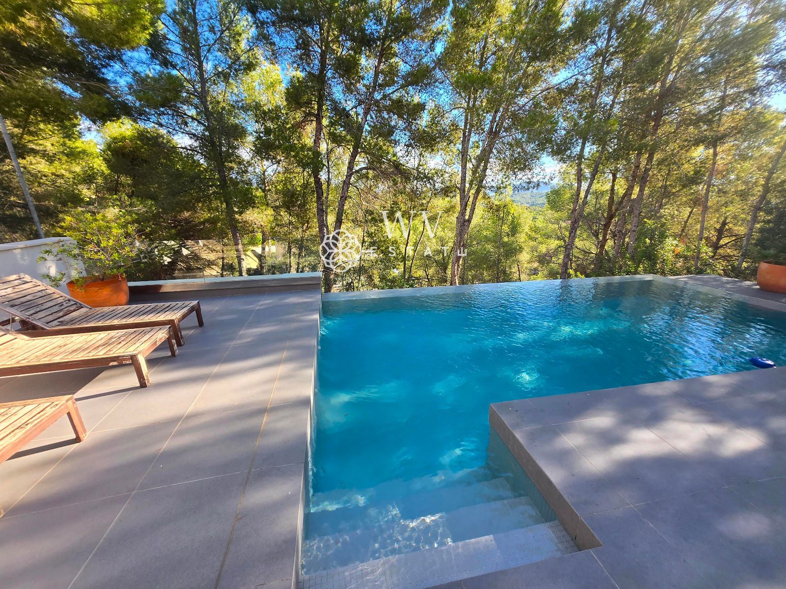 En el exterior, encontramos una espectacular piscina infinity privada rodeada de zonas ajardinadas, ofreciendo un espacio de tranquilidad y confort. La vivienda está equipada con aire acondicionado, garantizando bienestar durante todo el año.