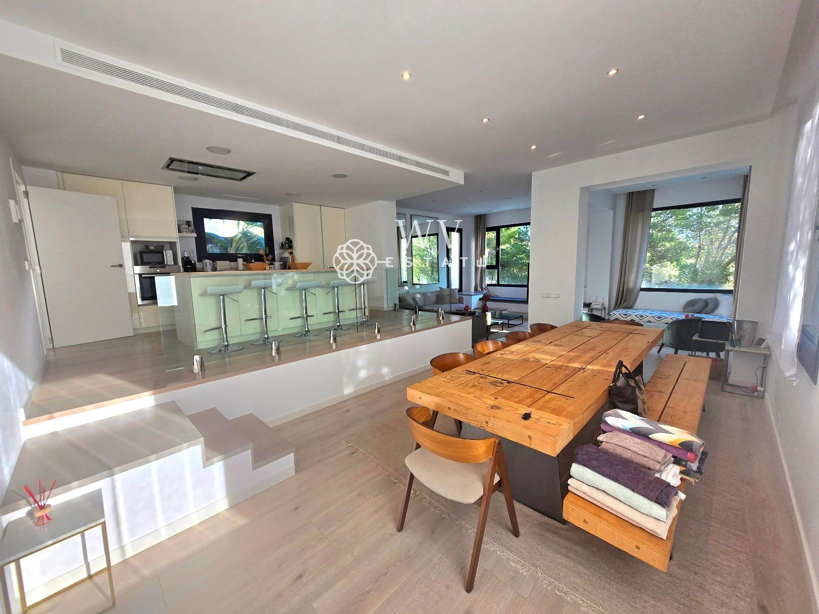 La casa destaca por su diseño diáfano y luminoso, con una cocina abierta que se integra perfectamente con un amplio salón con grandes ventanales, permitiendo la entrada de luz natural y vistas a las zonas exteriores.